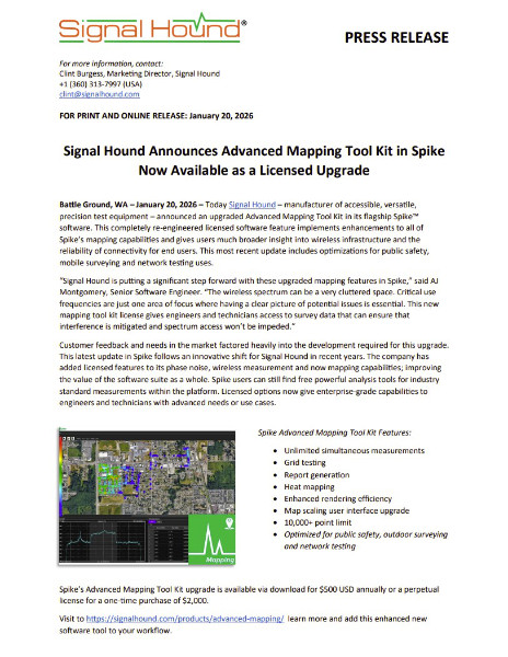 Signal Hound Announces Advanced Mapping Tool Kit in Spike