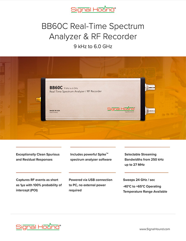 The BB60C real-time RF spectrum analyzer streams 140 MB/sec of digitized RF to your PC utilizing USB 3.0, providing an instantaneous bandwidth of 27 MHz, and sweep speeds of 24 GHz/sec.