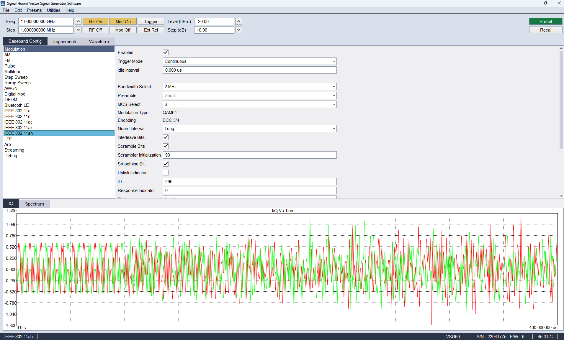 The VSG software supports standards-compliant signal generation of the IEEE© 802.11ah waveform standard, allowing physical layer measurements on WLAN receiving devices. Combined with a variety of configurable RF impairments and waveform sequence generation this capability enables:
