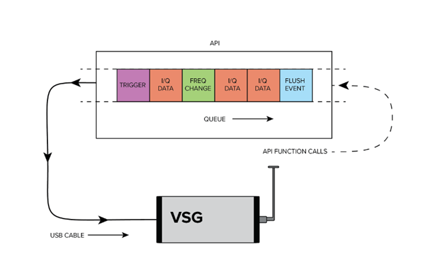 For long waveform generation or for transmitting a complex sequence of events such as frequency hopping or triggers, a collection of functions are available in the API which allow a user to buffer a sequence of configuration and transmit events.